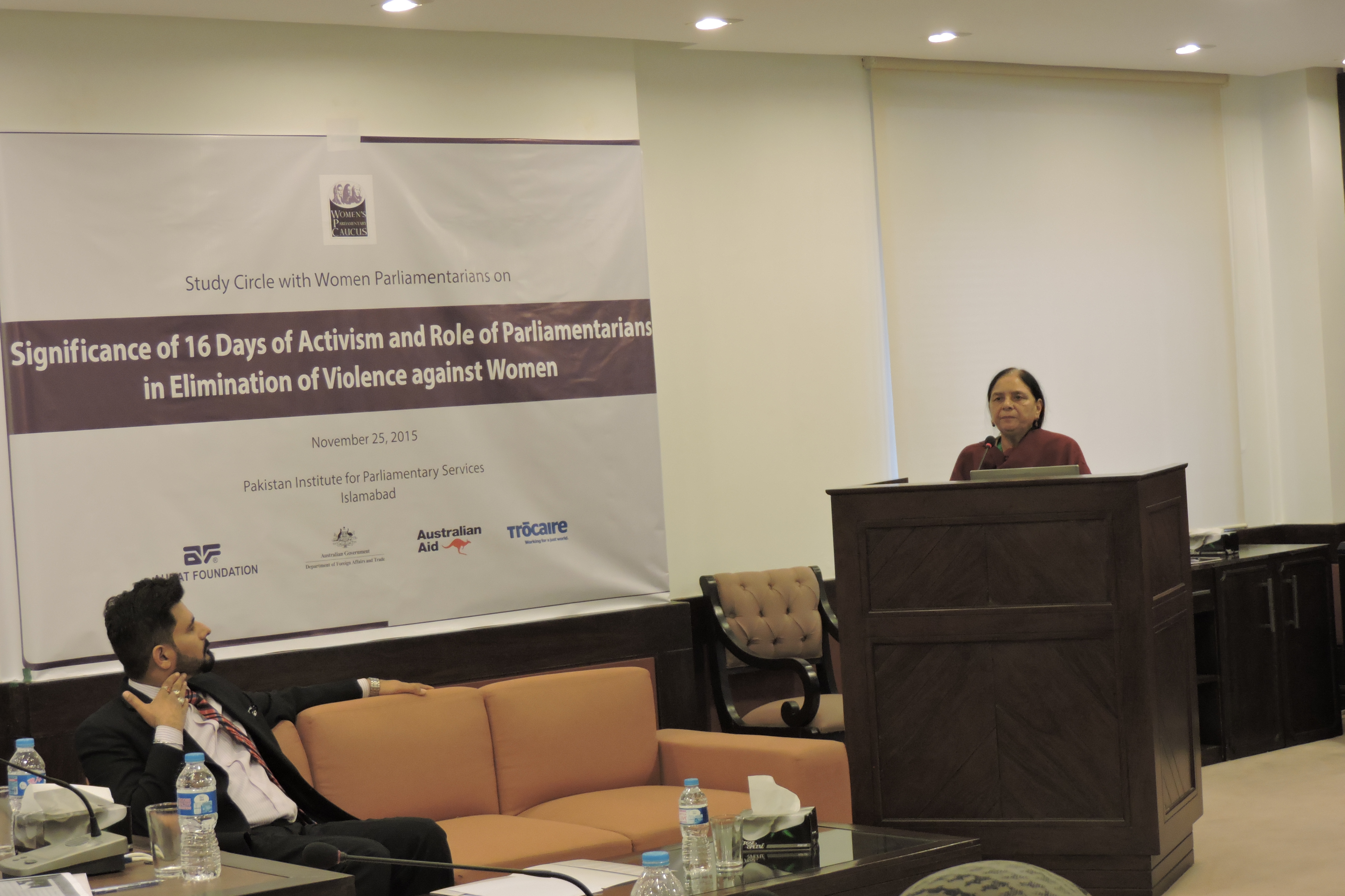 The theme for study circle was ‘Significance of 16 Days of Activism and Role of Parliamentarians in Elimination of Violence against Women’. The study circle was intended to highlight the systemic nature of gender based violence that encourages inequality and discrimination and how women parliamentarians can play an effective role in its elimination.