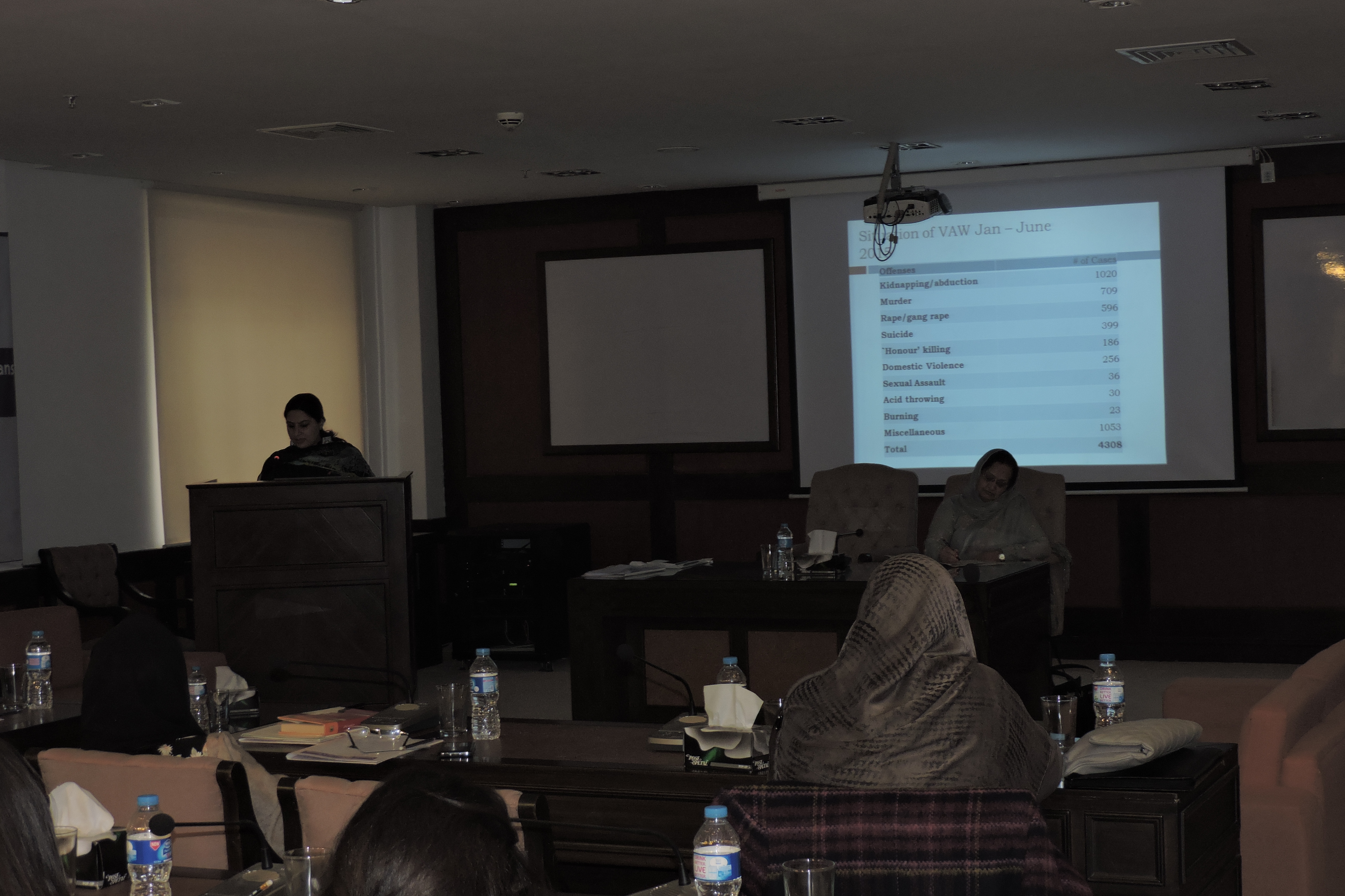Ms Rabeea Haid, while giving the figures of violence against women said that 7 women per day fall under the category of Murder, Honor killing and suicide, 5 women are kidnapped or abducted per day, 3 women are raped or gang raped daily, and 1 women face domestic violence every day.