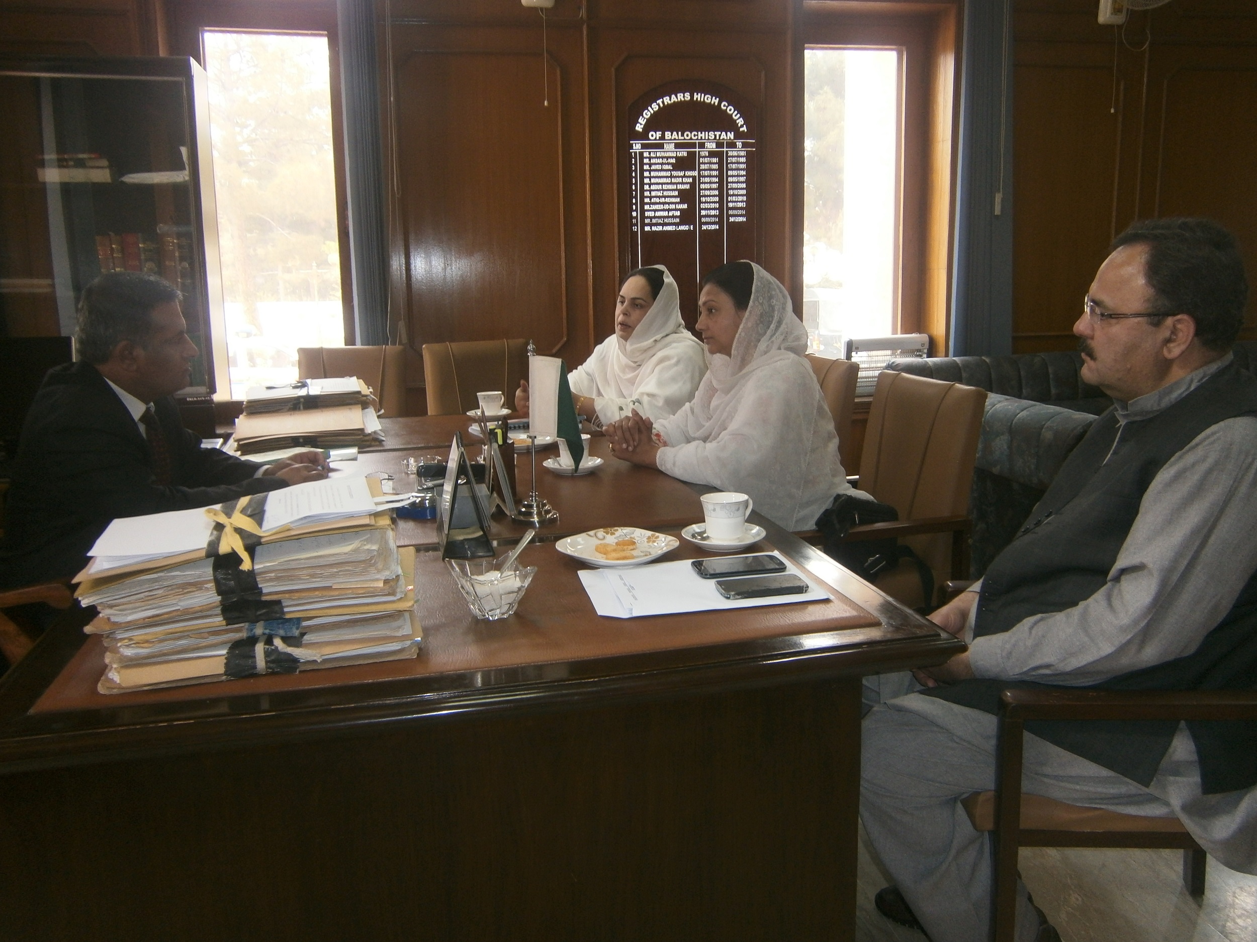 A delegation of Aurat Foundation’s Quetta office, comprising Resident Director, Deputy Programme Manager - GEP and IT officer GEP, visited the office of Honourable Chief Justice of Balochistan High Court Justice Muhammad Noor Muskanzai on 1 April 2016. The meeting was planned on the request of Aurat Foundation regional office and a renowned woman lawyer Ms. Irum Mehmood to discuss the issue of the implementation of Anti-Sexual Harassment Act 2010 in the premises of courts, establishment of women friendly spaces and development of Gender Sensitive HR policies for court premises in Balochistan.