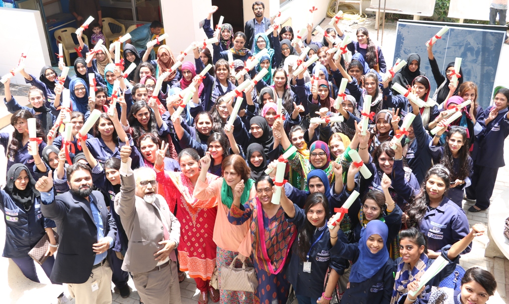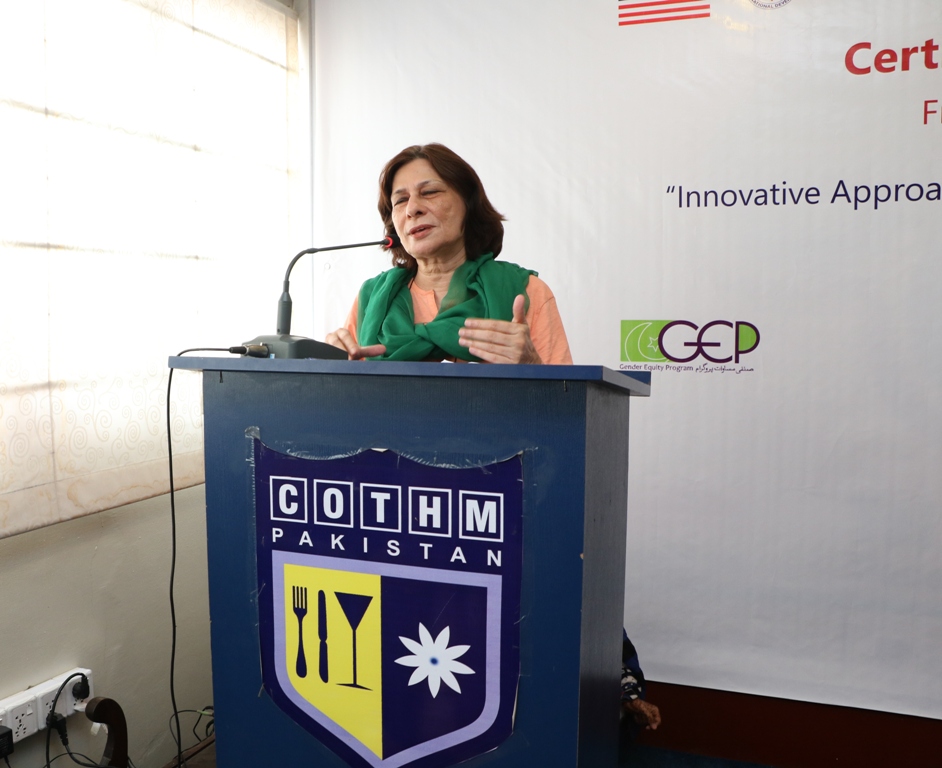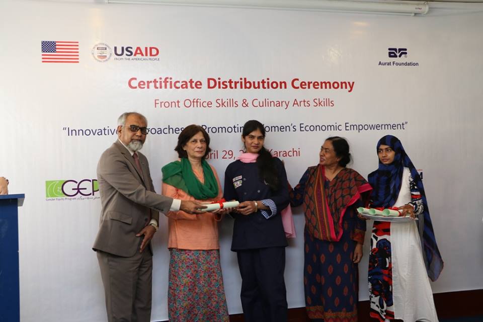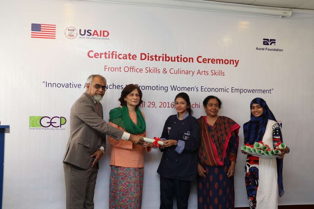 After 3-month trainings, conducted by College of Tourism and Hotel Management (COTHM), a team of 80 females received their certificates in ‘Front Office Skills’ and ‘Culinary Arts Skills’. The trainings were conducted under USAID supported Gender Equity Programme (GEP) of Aurat Foundation titled ‘Innovative Approaches to Promoting Women’s Economic Empowerment’. These women from less privileged localities of Orangi Town, Malir, Kemari and Korangi of Karachi, also received trainings in ‘Basic Computer Skills’ and ‘English Language & Communication’ for enhancing their confidence and facilitating their entry into the industry. The certificate distribution ceremony was held on 29 April, 2016, at the COTHM Karachi Campus in Gulshan-e-Iqbal. As part of the GEP, COTHM is also supporting the certified trainees in getting employment, and some of the trainees have already been hired by renowned corporates like Marriott Hotel, Pak Airways, KFC and Pizza Hut, while others have their interviews lined up in the coming weeks.