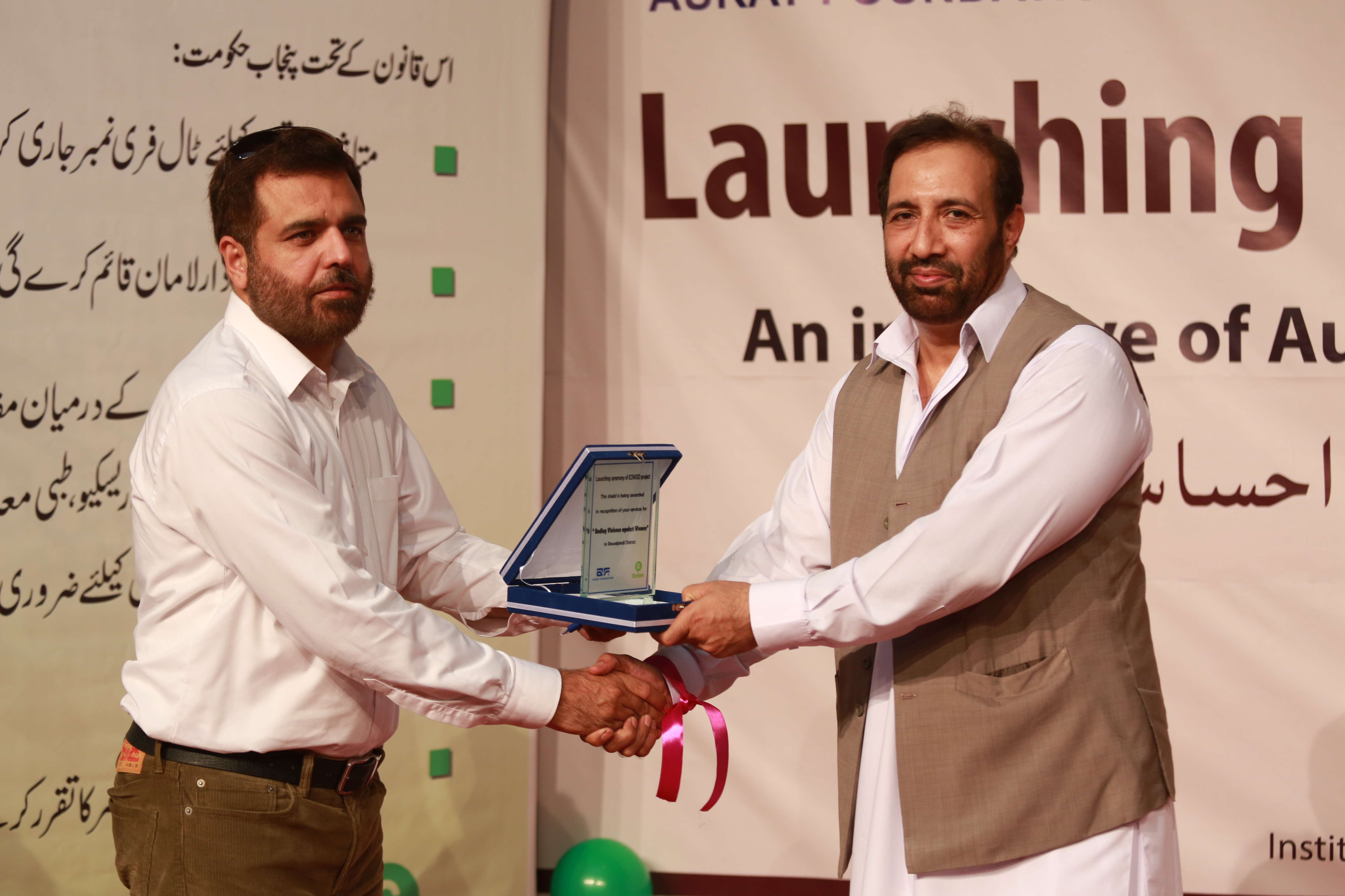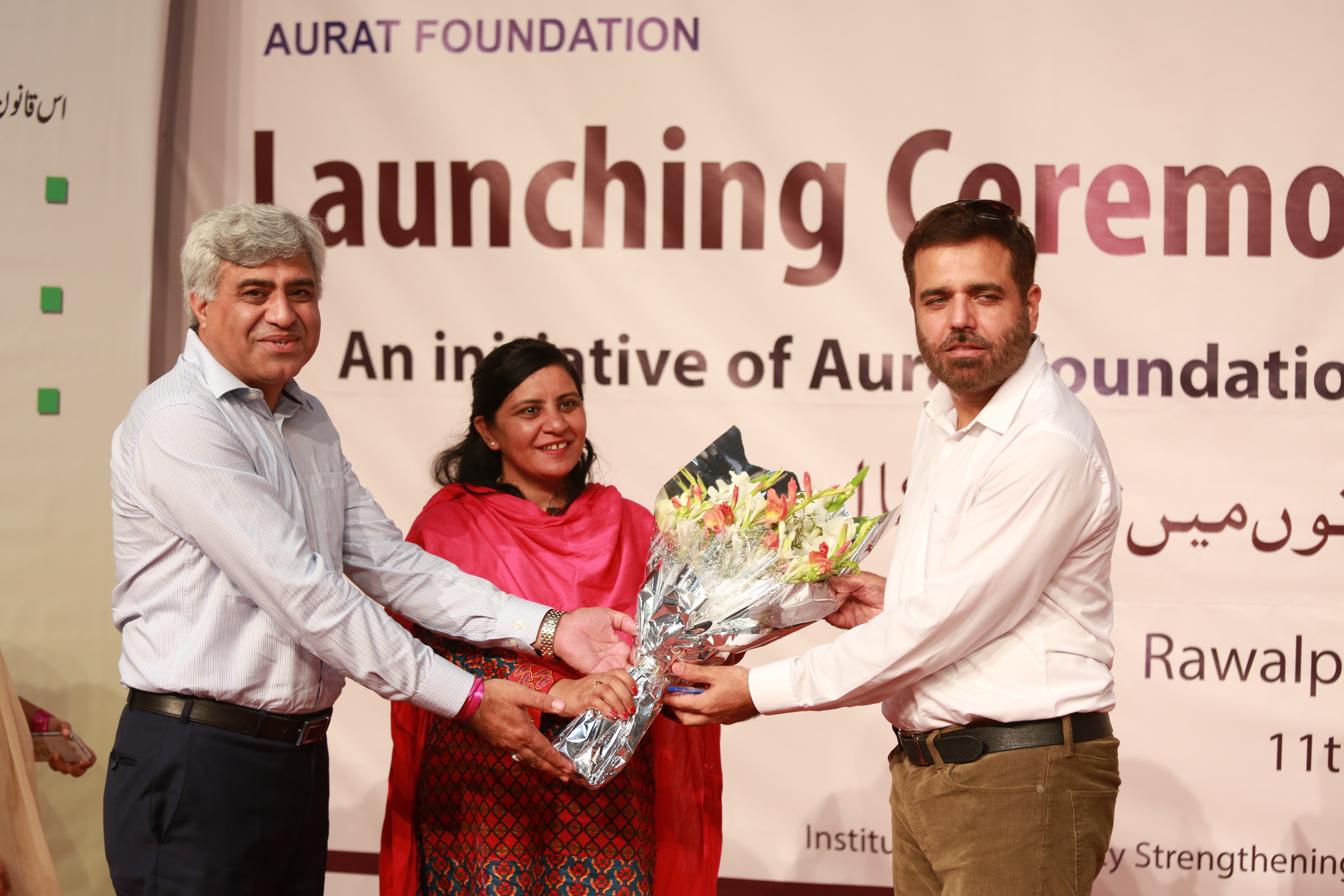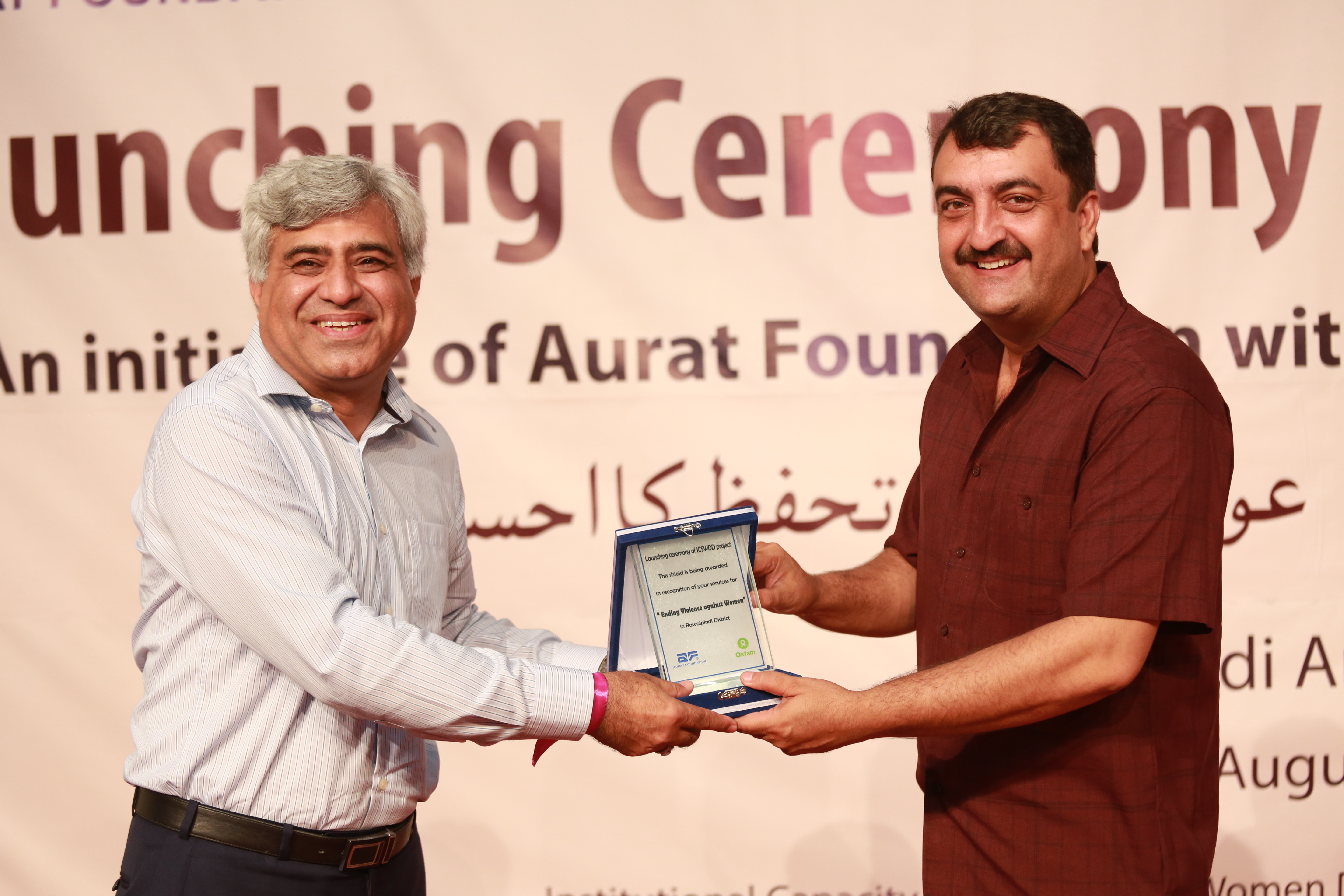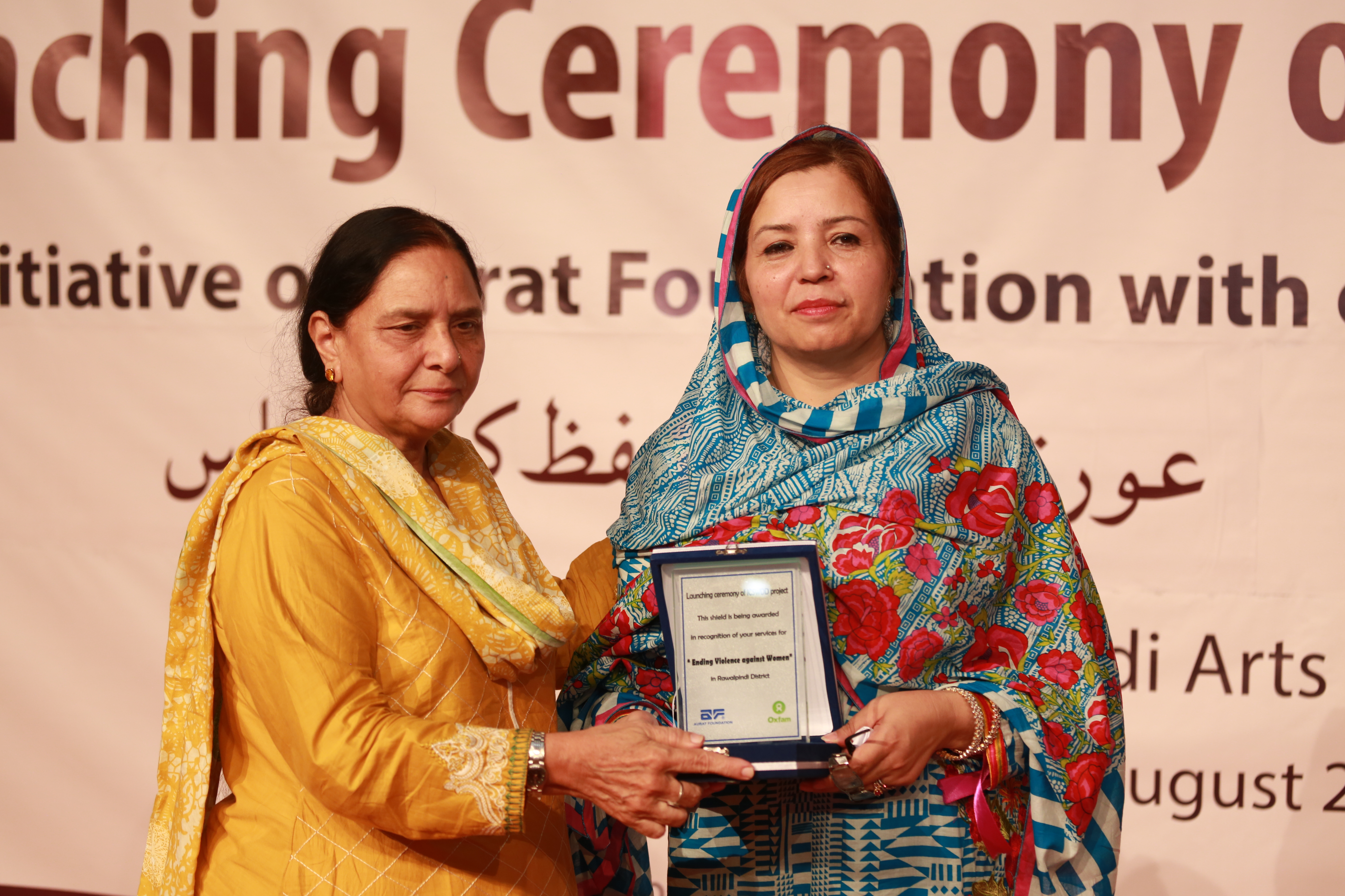 Mr. Shafique Chaudhry, Member NCHR, Mr. Sajid Mehmood, Associate Country Director Oxfam, Ms. Khalida Perveen, SHO, Rawalpindi, Ms. Sarkar Abbas, Advocate Supreme Court, Ms. Asma, Superintendent Dar-ul-Aman, Ms. Mumtaz Mughul, Resident Director, Aurat Foundation, Ms. Razia Sultana and Ms. Riffat Sultana, President and Secretary (respectively) Women Leaders Group Rawalpindi, Mr. Younas Khalid, Chief Strategy and Policy Officer, Aurat Foundation, Mr. Asim Malak, Director Outreach and Networking, Aurat Foundation, Ms. Saleema Muneer, Programme Manager Oxfam, were presented shields for their services for women’s rights.