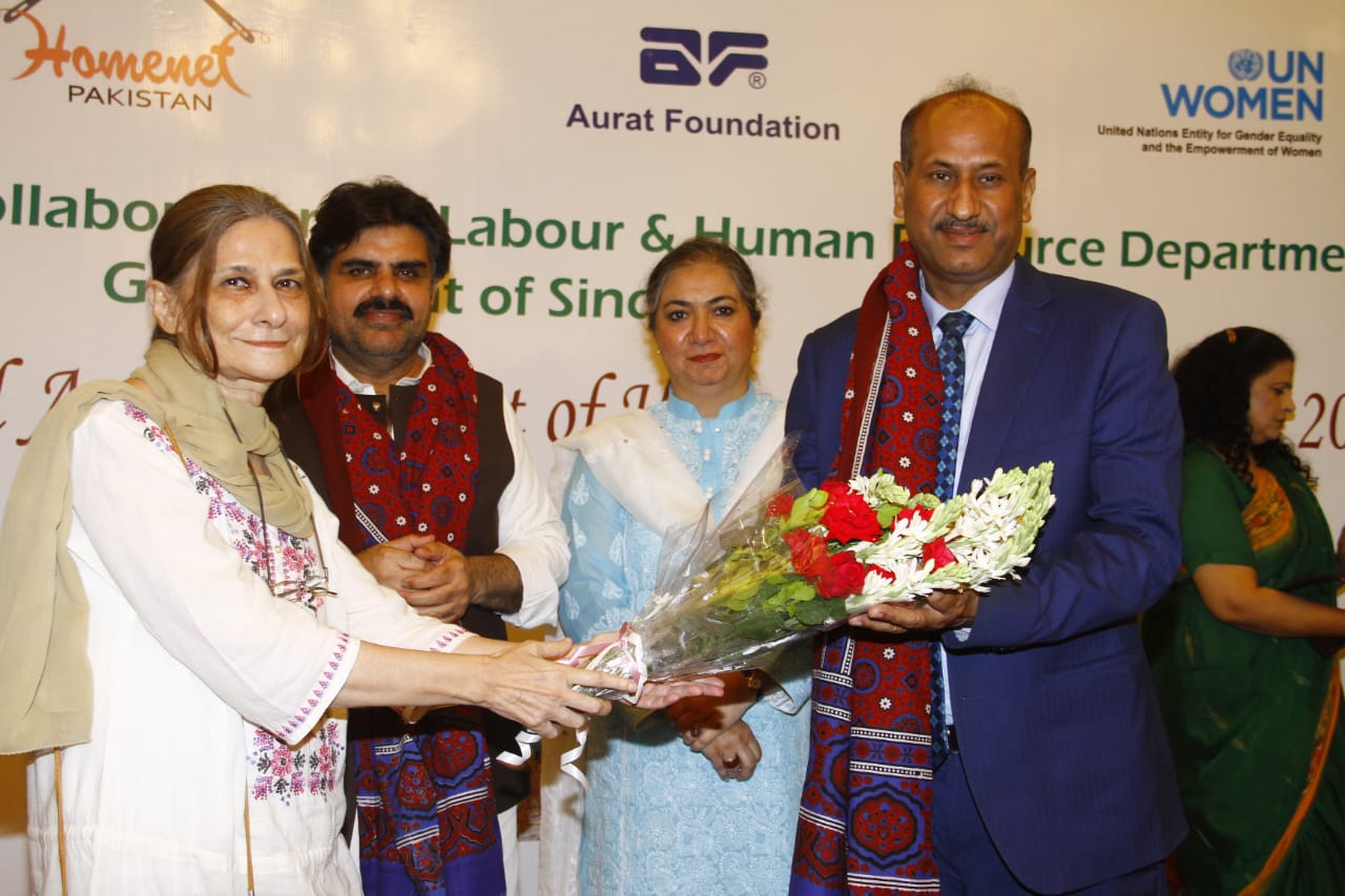 Aurat Foundation & HomeNet Pakistan in collaboration with Labour& Human Resource Department of Government of Sindh held an event to celebrate the passage of law for home based workers and to applaud Members of Provincial Assembly of Sindh at hotel Move ‘n’ Pick Karachi. This program was attended by a large number of people including workers, trade unionists, employers, government officials, & MPAS from different political parties.