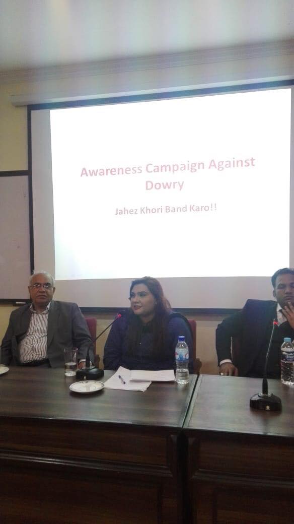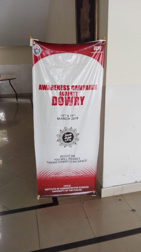 The Institute of Administrative Sciences Punjab University has arranged a seminar with the collaboration of Aurat Foundation Lahore. The objective of this session was to create awareness among youth on anti-dowry campaign. This issue exists countrywide, but the ones effected more the upper-middle and lower- middle socio-economic classes. In the context of Pakistan, the dowry was not a tradition but has recently, become an issue in our community which leads to domestic violence in various forms The panelist was Dr. khalida Amjad, senior visiting faculty Doctorate in Arabic, Mr. Adeel Asghar Hashmi family lawyer from High court Lahore, Mr. Tanvir Sadiq, Ms. Sarah Sheraz, Provincial Manager (AF-Lhr) & Ms. Samina Javed, Program officer (AF-Lhr). Ms. Sarah Sheraz represent the AF, and shared the history, vision, mission and contribution of Aurat Foundation to empower the women and marginalized community. She added that AF is against this so-called tradition, which is becoming the monster day by day and collaborative efforts are much needed to get rid from this, otherwise it will ruin the coming generation. This disease is not only spoiling the lives of women as far as men also. Mr. Adeel Asghar (Advocate) discussed with the reference of constitution and law. He shared his perspective in the context of Anti Dowry legislation. The other panelists also shared their views in this regard, and show their commitment to end this economical violence.