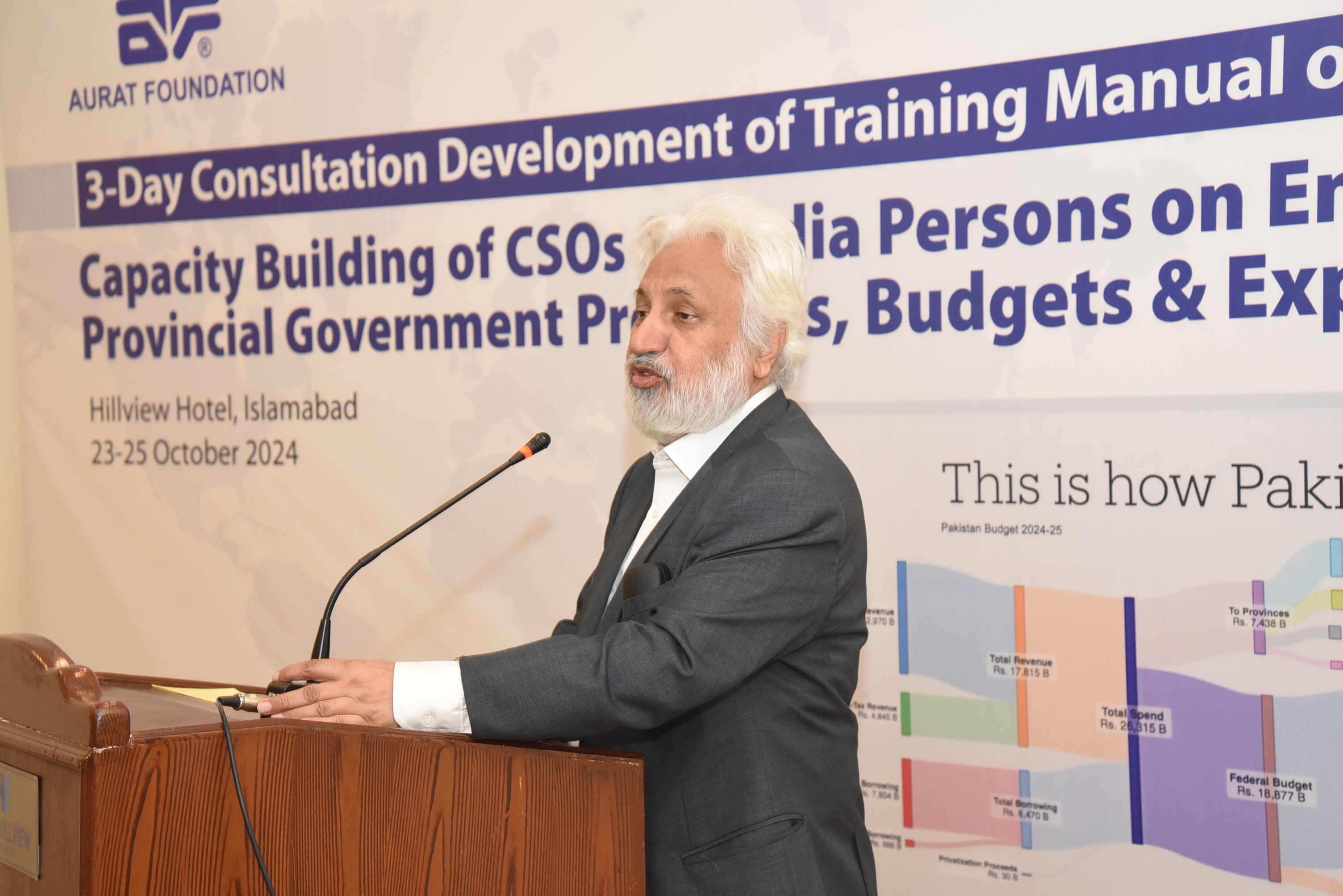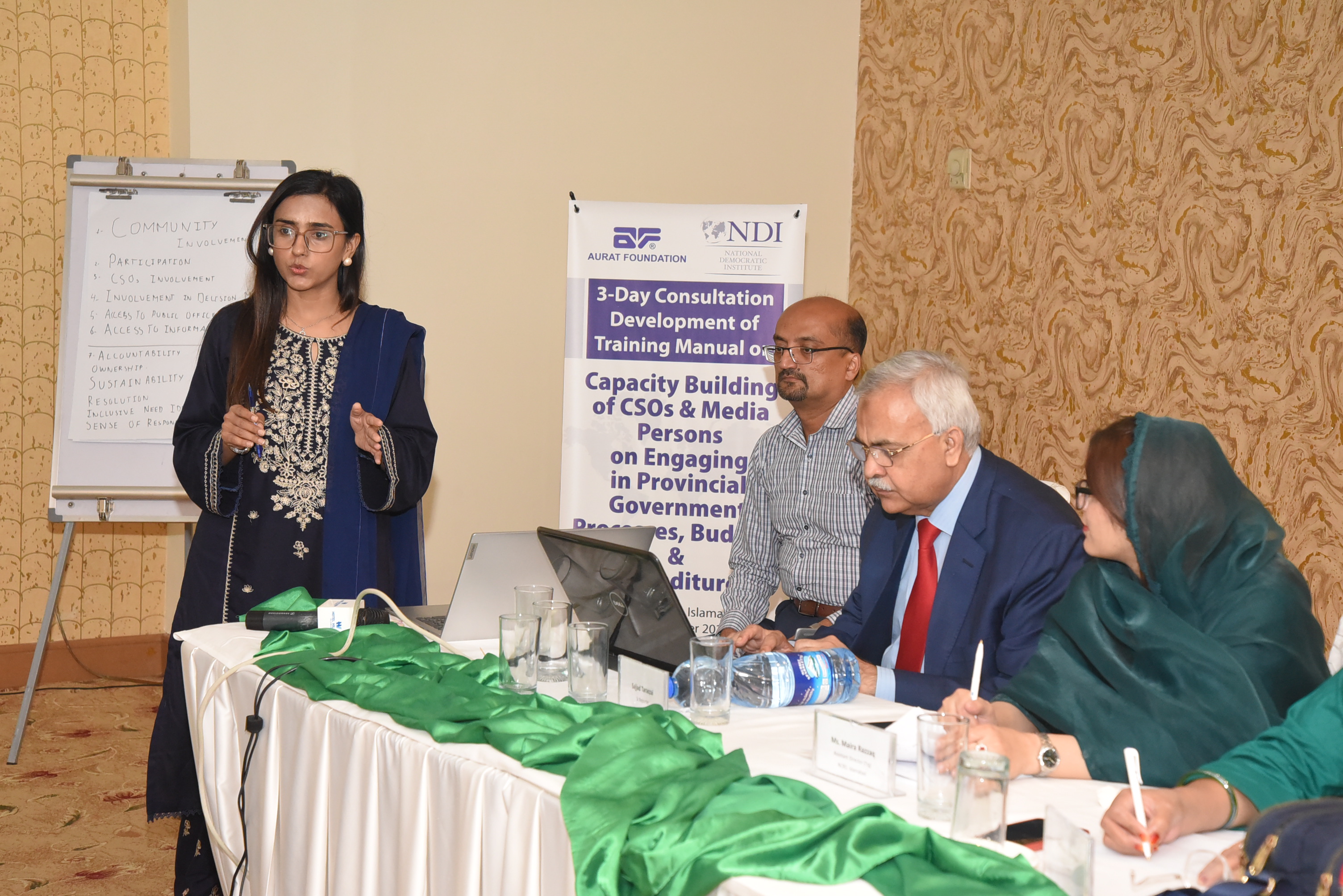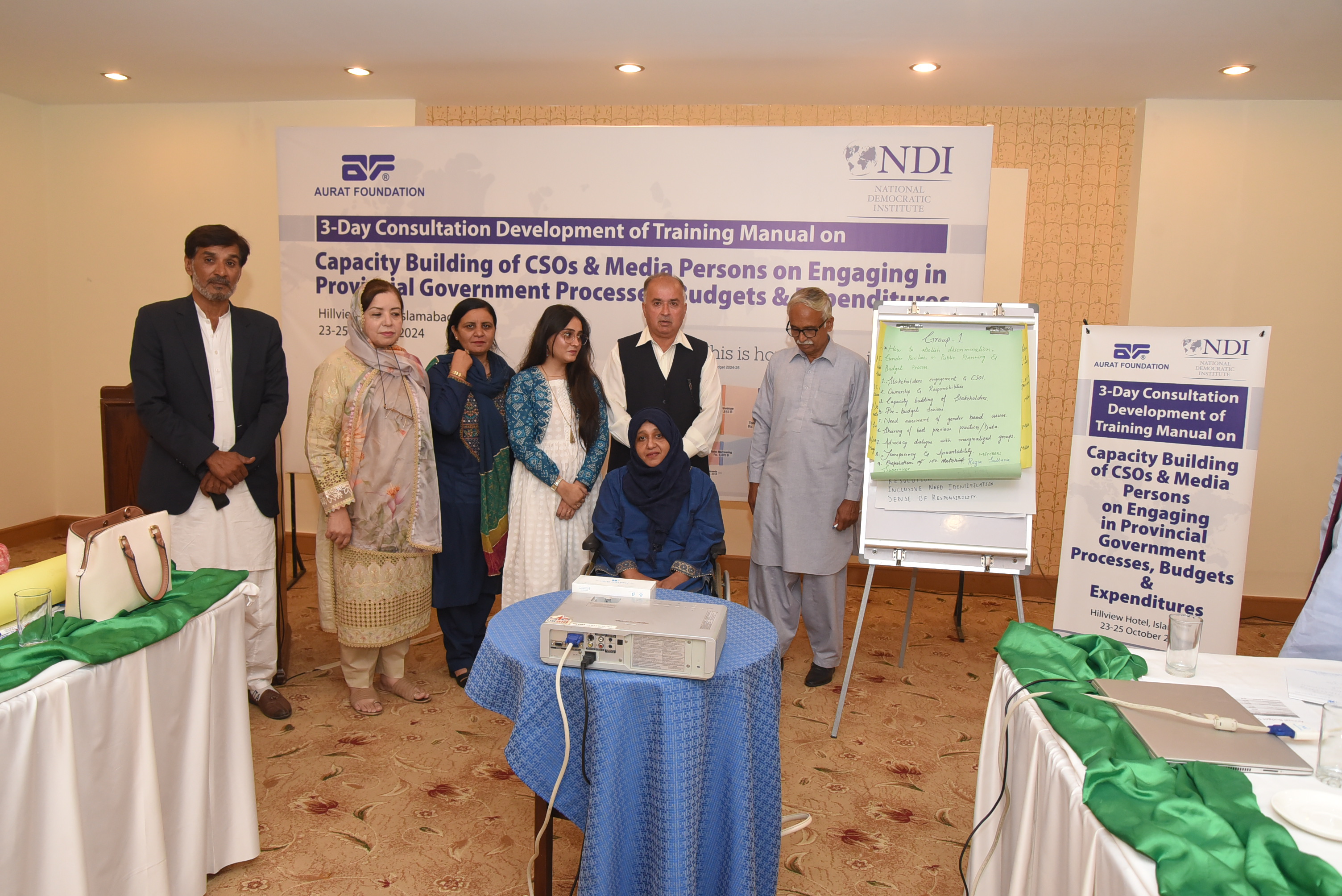 The workshop facilitated by the Aurat Foundation and sponsored by the National Democratic Institute (NDI) was conducted from October 23-25, 2024 in Islamabad. This workshop included valuable insights from Mian Najeeb Aslam, former Director General of Local Government and Community Development in the Government of Punjab, and Governance Specialist at the Asian Development Bank, Pakistan.