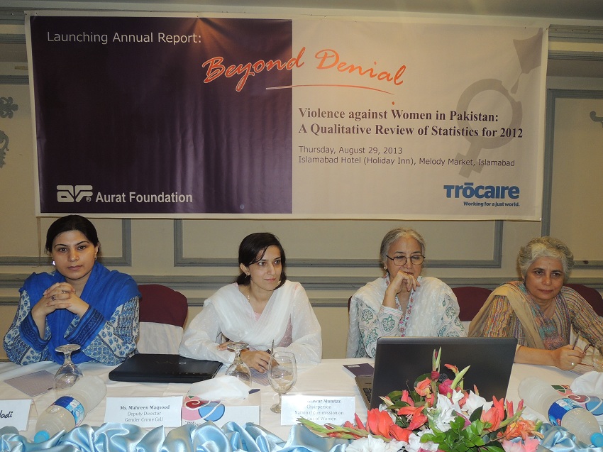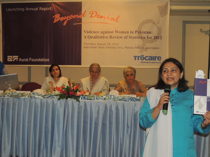 Aurat Foundation launched Annual Report on violence against women for year 2012 on August 29, 2013, at Islamabad. The report contained a data on violence against women during year 2012, collected and composed under ‘Gender Based Violence Policy Research & Capacity Building (GB-PRCB)’ programme of Aurat Foundation, in collaboration with Violence against Women Watch Group. The data was written and analyzed by Dr Rakhshinda Perveen, Consultant and Founder Creative Anger by Rakhshi. The technical review was done by Mr Naeem Mirza, COO Aurat Foundation, Ms Maliha Zia, Manager Law and Gender, and Ms Rabeea Hadi, In-charge GBV-PRCB programme. As part of its continuous efforts to highlight the issue of violence against women and its different manifestations in Pakistani society, the Aurat Foundation, with the support of Trocaire, has been monitoring the cases of violence against women in Pakistan for the last five years, since 2008, and has so far launched four reports on violence against women. This is the fifth report which shares the data of cases of violence against women during 2012. Ms Rabeea Hadi, in-charge of the programme, moderated the session and took up the question-answer session.